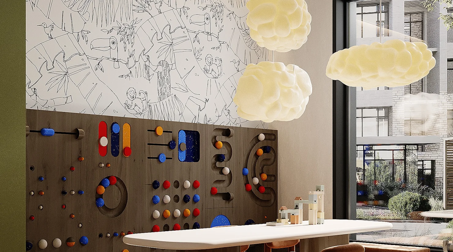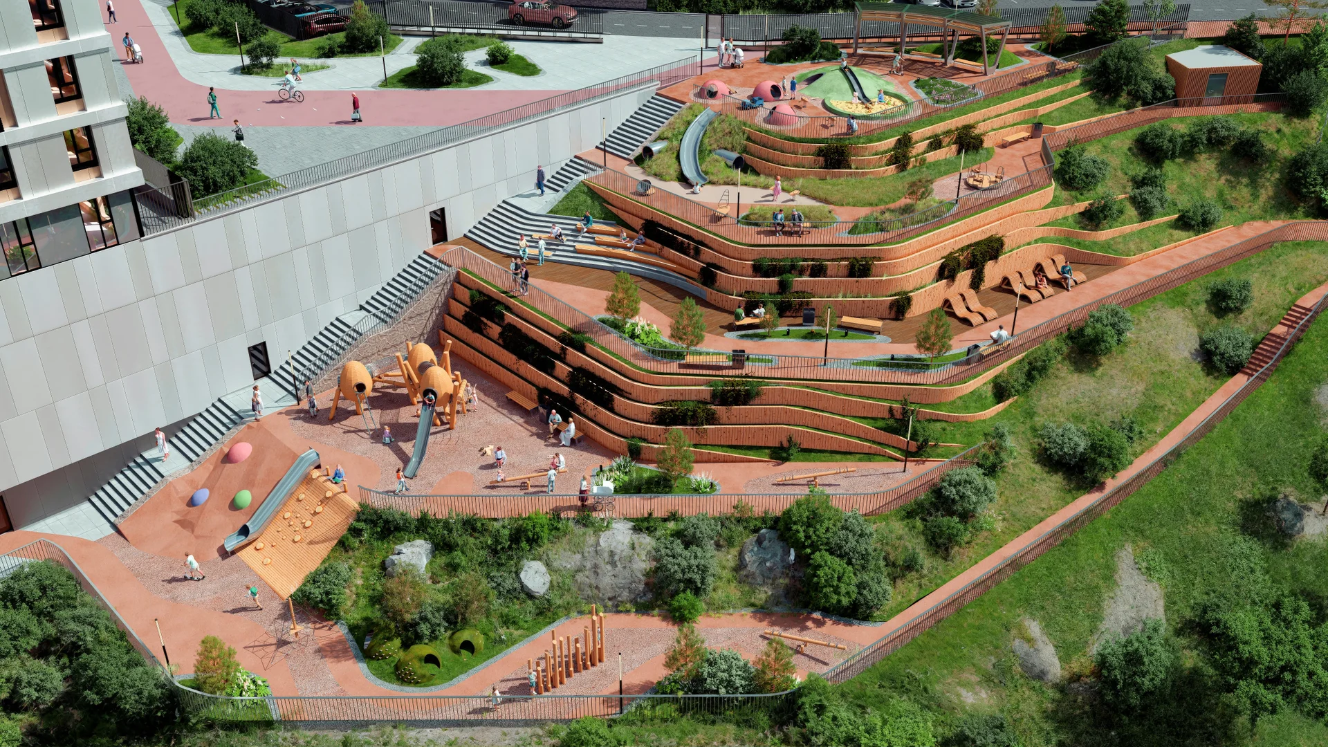 38% территории —это деревья, газоны и уютные зоны отдыха. Для взрослых предусмотрены спортивные зоны и Wi-Fi на свежем воздухе, чтобы двор стал местом встреч и активной жизни